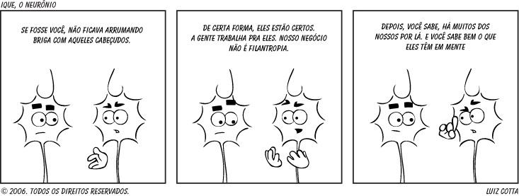 Revendo algumas das velhas tiras que não se perderam, encontrei algumas que falam de estatura e cabelo. O Ique é um neurônio! Nem estatura, nem o corte de cabelo importam. Mas escrever a tirinha era como olhar no espelho sem gostar do que eu via.